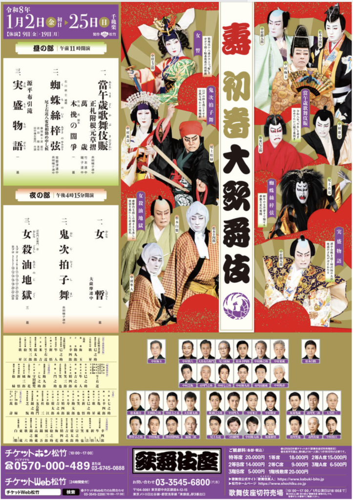 ●新悟丈が、2026年1月2日(金)〜25日(日)歌舞伎座の「寿 新春大歌舞伎」昼の部『當馬歳歌舞伎の賑(あたるうまどしかぶきのにぎわい)木挽の闘争』と、夜の部『女暫』『女殺油地獄』3作に出演します。チケットのお申し込みは、やごの会事務局へお願い致します。『女殺油地獄』はAプロ、Bプロがありますので、下記詳細の「歌舞伎美人」をご確認のうえ、チケットをお申し込みください。
