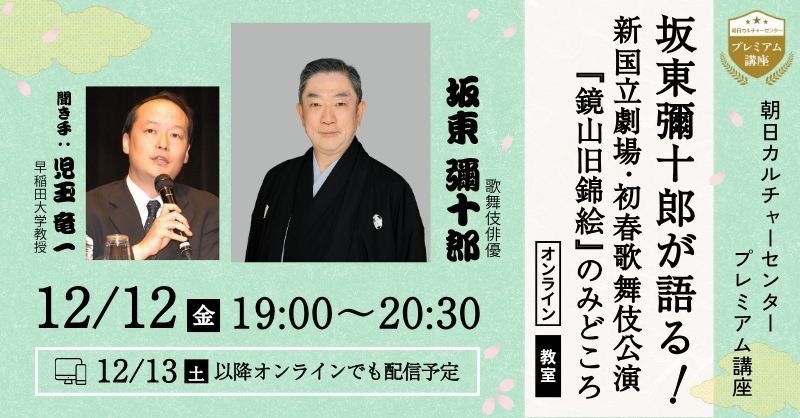 ●彌十郎丈が、12月12日(金)19:00〜20:30“朝日カルチャーセンター”で講師をつとめます。内容は、年明け1月に新国立劇場中劇場で幕を開ける『通し狂言 鏡山旧錦絵』の見どころや局岩藤の役づくりの裏話、歌舞伎における「悪」と「情」の表現など。聞き手は、早稲田大学教授であり歌舞伎の研究と評論を専門とする児玉竜一さんです。公演チケット付きの教室受講やチケットなしの教室受講、チケットなしのオンライン受講から選べます。受講チケットは、下記「詳細はこちら」からお申し込みください。