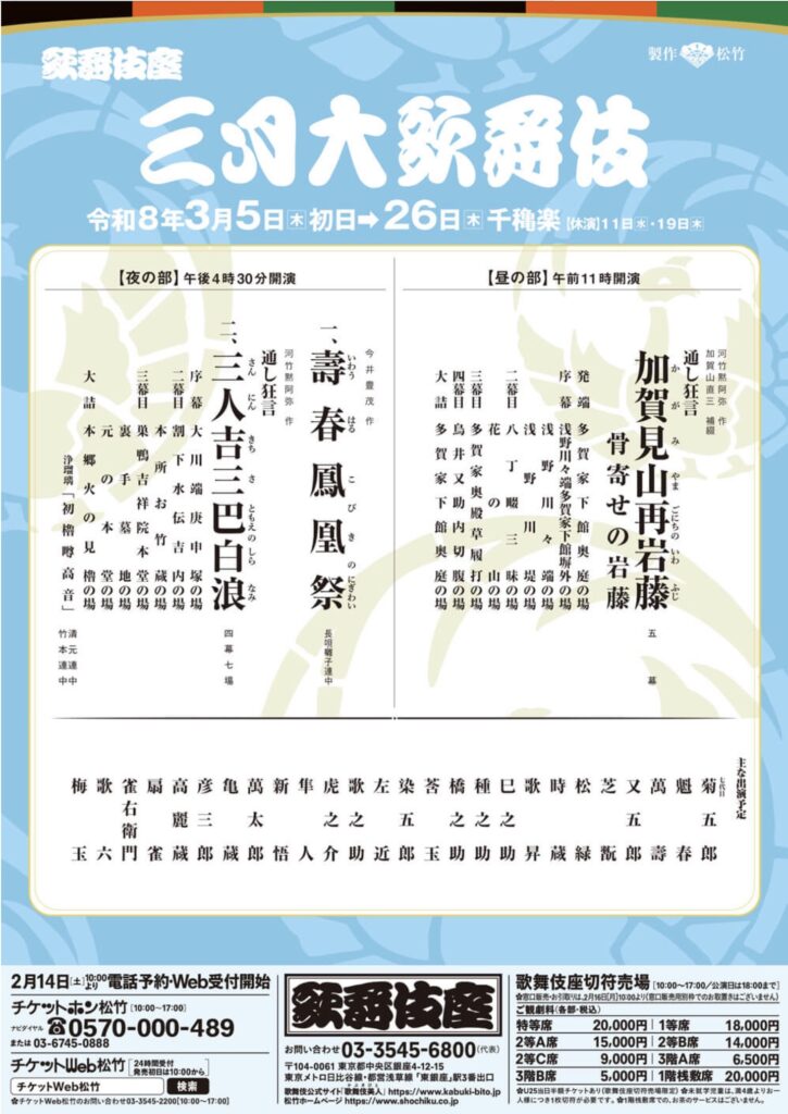 ●新悟丈が、2026年3月5日(木)〜26日(木)歌舞伎座 三月大歌舞伎に出演します。チケットのお申し込みは、やごの会事務局へご連絡ください。